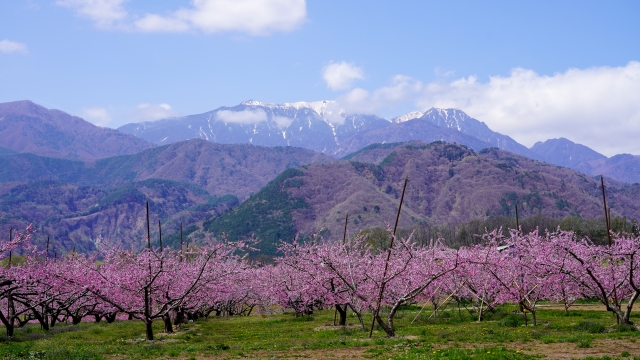 4月上旬から中旬に訪れれば、南アルプスをバックにした満開の桃畑と、桜の花びら舞い散る新府城跡を同時に楽しむことができます。